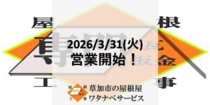 2026/3/31お気軽にお問合せください! おはようございます!草加市の屋根屋ワタナベサービスです! 本日、3月31日火曜日の営業を開始いたします! 屋根修繕や雨樋修繕等のお見積り依頼やご質問、お気軽にお問合せください […]