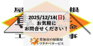 2025/12/14お気軽にお問合せください!! おはようございます!草加市の屋根屋ワタナベサービスです! 本日、12月14日日曜日8:00より、お問合せ承ります! お見積り依頼やご質問等、お気軽にお問合せください! お […]
