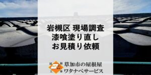 岩槻区瓦屋根現場調査 お世話になっております。草加市の屋根屋ワタナベサービスです! 漆喰塗り直しのお見積り依頼を頂き、岩槻区にて現場調査を行わさせて頂きました。 お見積り依頼、誠にありがとうございます! 瓦屋根の基本メン […]
