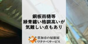 銅板雨樋等気難しい点もあり お世話になっております。草加市の屋根屋ワタナベサービスです! 今現在では塩ビで造られた雨樋が一般的ですが、銅板で造られた雨樋も存在します。 緑青を纏い特別を感じさせる格調高い雨樋です。 昔の考 […]