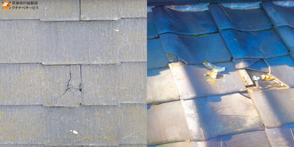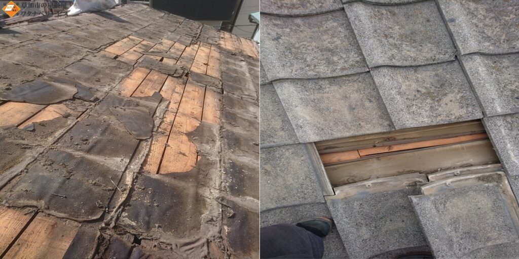 雨漏りの原因とされる症状は、割れ等の破損や台風等が原因で飛散してしまった等の原因があります。
