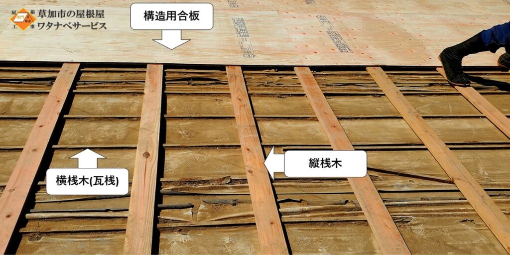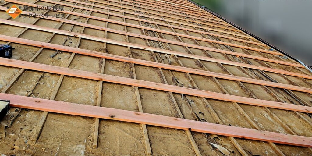 弊社が施工する葺き替えは、既存横桟木(瓦桟)を解体せずに縦桟木を瓦桟に直行して施工します。