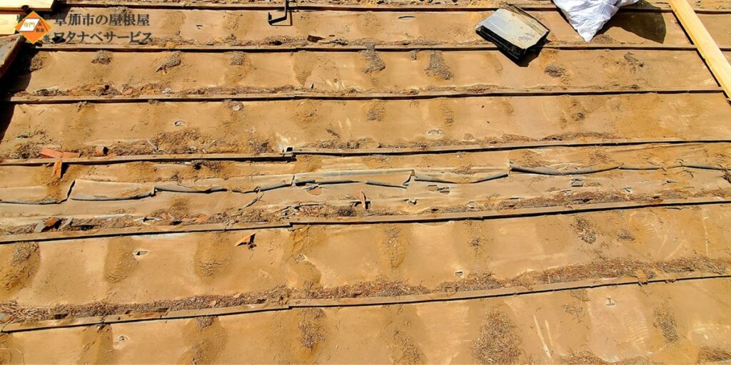 瓦を解体して表れた防水シートは、めくれ上がりや裂けなどが目立つ状態です。