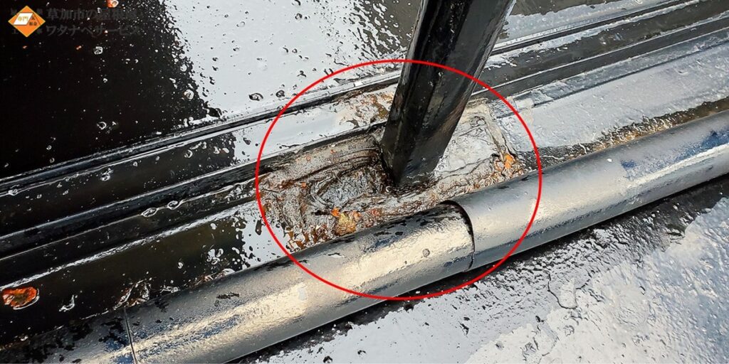 こちらの瓦棒葺きトタン屋根の雨漏り原因は、鉄製ベランダの足から雨漏りです。