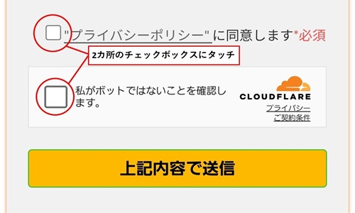 送信ボタン上部に設置している、【スパム対策(cloudeflare)】及び【プライバシーポリシーの同意】をお願いいたします。