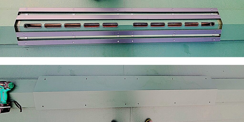施工に関してですが、通常の棟板金を換気部際で立上げ加工を行い、換気部に被せる棟板金を折り下げて止水処理及び化粧をするべきだと考えられます。