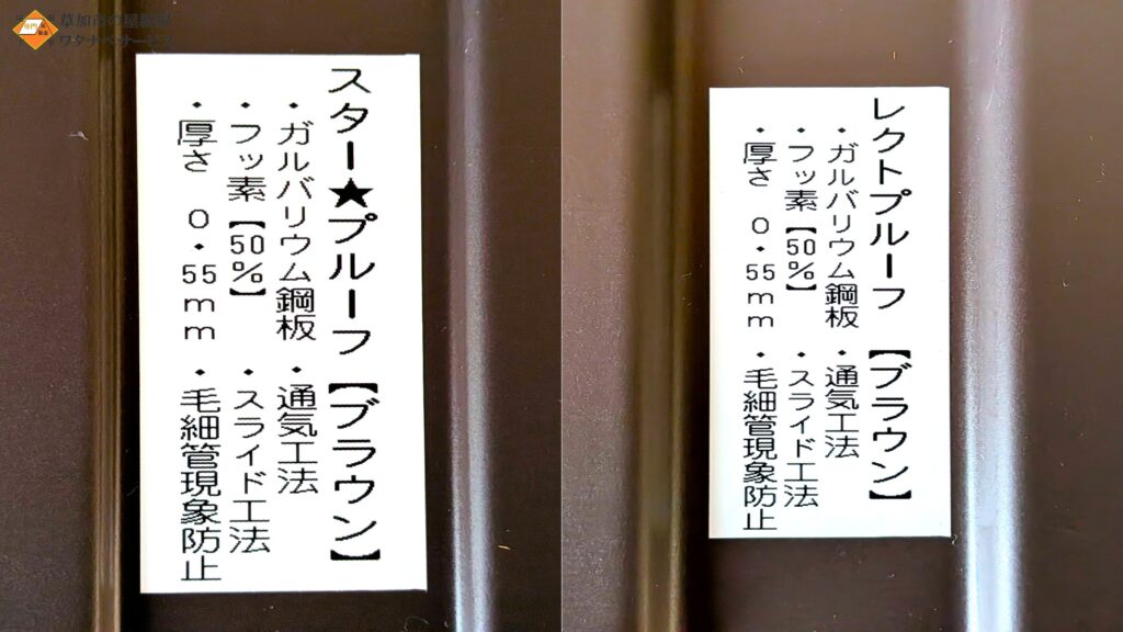 【レクトプルーフ・スタープルーフ】と【他メーカーフッ素屋根材】で比較するとレクトプルーフの方がフッ素含有率の高さや鋼板厚等のスペックからレクトプルーフの方が耐久性が高い事が確実です!