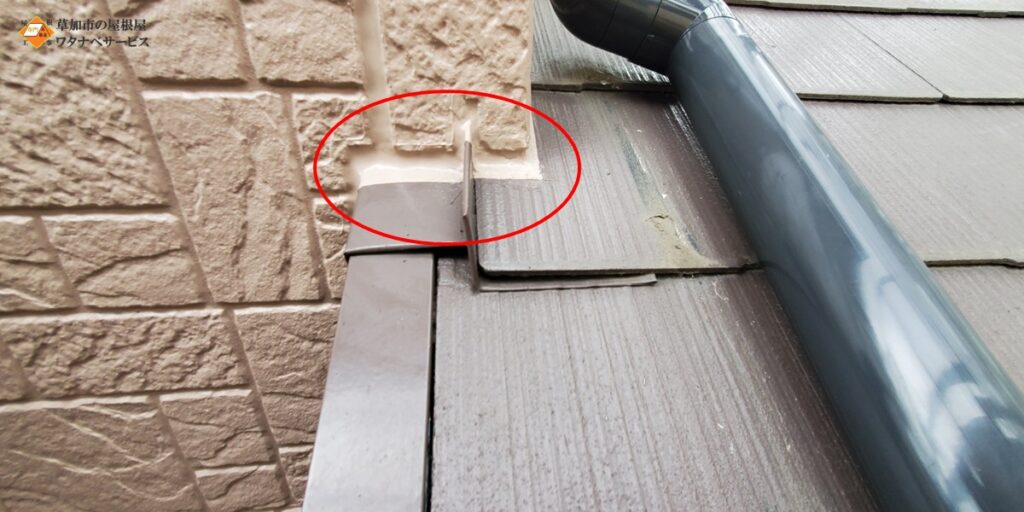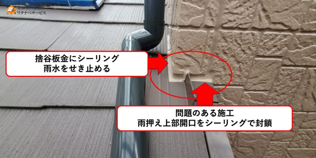 【基礎の上に有る土台水切り】【1階高さの屋根と外壁のとの取り合い部分の雨押え板金・捨谷板金】との間に隙間があるからとコーキングを塗る塗装業者さんやシーリング屋さんが沢山います。