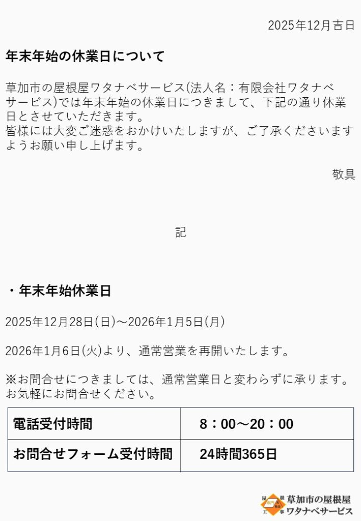 - 【2025年12月15日月曜日営業開始!】お気軽にお問合せください!2025/12/15営業開始! おはようございます!草加市の屋根屋ワタナベサービスです! 本日、12… 続きを読む: 【2025年12月15日月曜日営業開始!】お気軽にお問合せください!