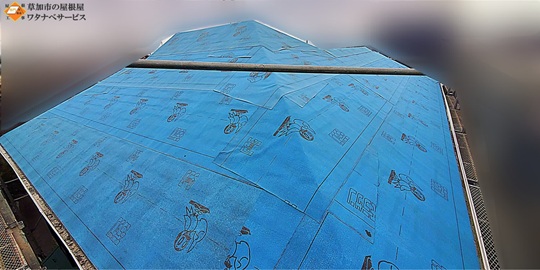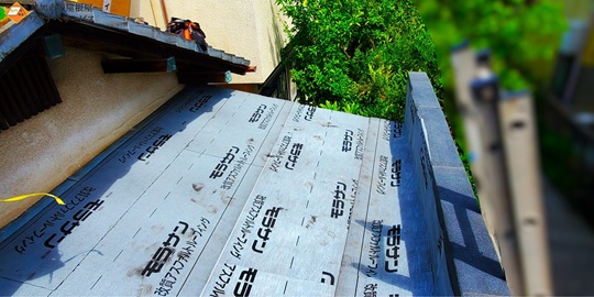防水シートは、超高耐久品を選定し、防水シートの重ね代を必ず規定以上設ける事や、屋根の面と面の繋ぎ目を必ず完全複層で仕上げる、長期間、高い防水性を維持する防水シート工事。